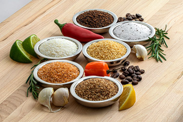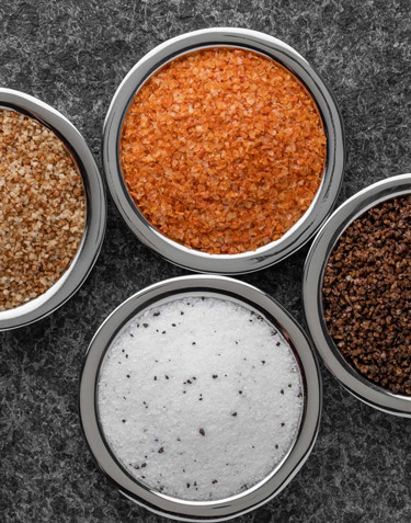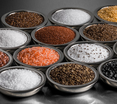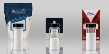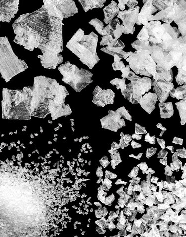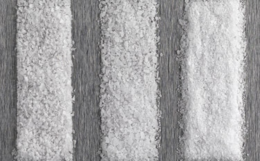 Clockwise from top left: Macro Flake™, Kosher Flake, Mini Flake™ and Micro Flake™ under 5x magnification