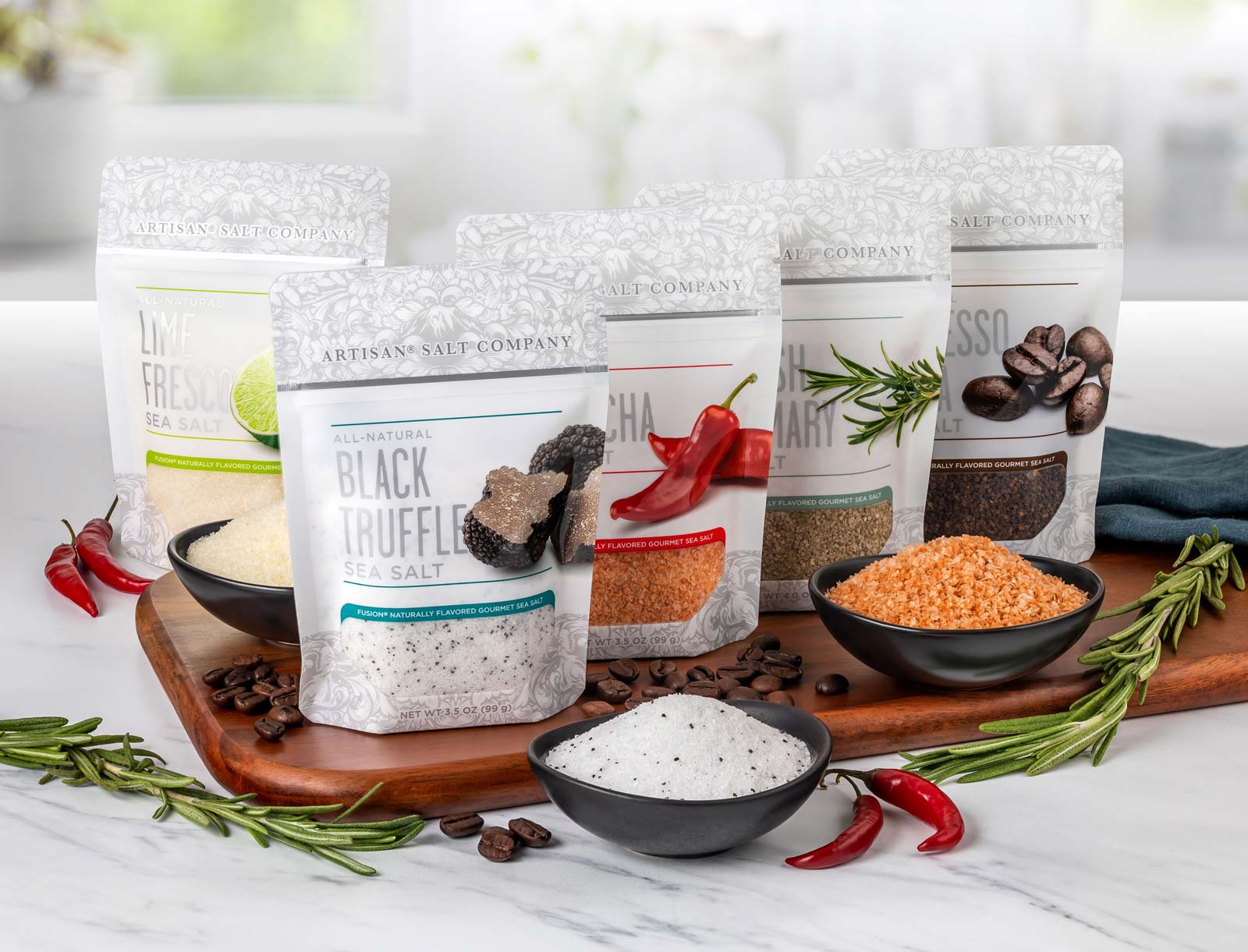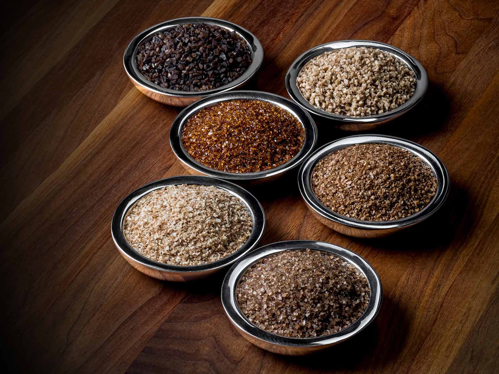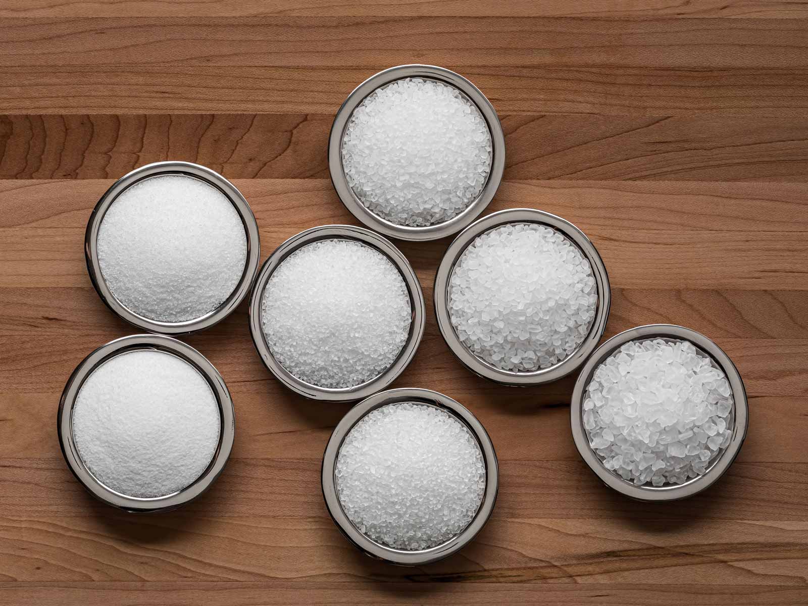 Clockwise from top left: Macro Flake™, Kosher Flake, Mini Flake™ and Micro Flake™ under 5x magnification